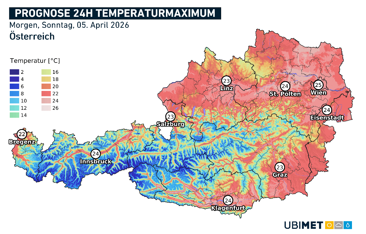 Pünktlich zum Ostersonntag sorgt ein Zwischenhoch verbreitet für sonniges und warmes Wetter. Tagsüber ziehen ein paar Schleier- und Quellwolken durch, welche aber harmlos bleiben und den weiterhin vorherrschenden Sonnenschein kaum trüben. Die Temperaturen steigen bei meist nur schwachem Wind auf 18 bis 24 Grad, lokal zeichnen sich auch Spitzen bis 25 Grad ab. Ab dem späten Abend nimmt dann von Vorarlberg bis ins Waldviertel die Schauerneigung zu, vereinzelt entstehen auch Gewitter.